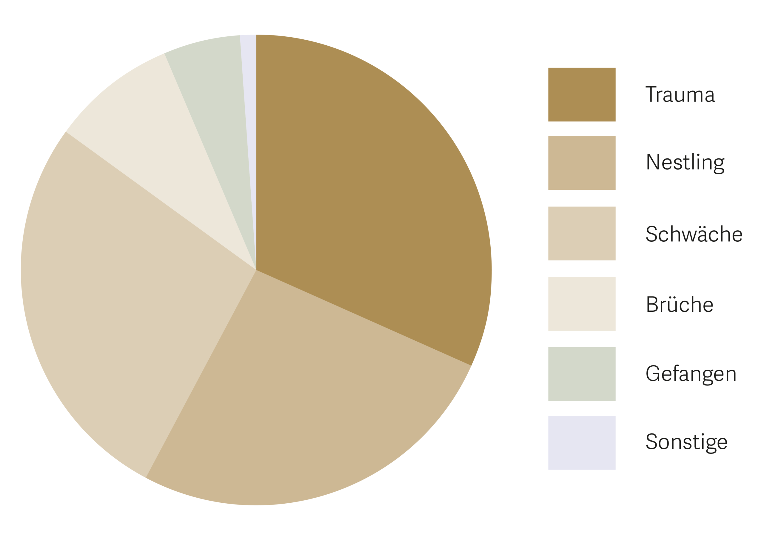 Die Gründe für die Behandlung geben ein bekanntes Bild ab. Die meisten Patienten werden mit einem Trauma eingeliefert (31 %), häufig infolge einer Kollision. Jungvögel, die aus dem Nest gefallen sind oder einen gescheiterten Flugversuch hinter sich haben (26 %), sorgen in den Sommermonaten für Hochbetrieb in der Station. In der kalten Jahreszeit überwiegt Schwäche als Behandlungsgrund (27 %), weil die Greifvögel zu wenig Nahrung finden und schnell Energie verlieren. Brüche (8.5 %) und das Verfangen in Räumen oder Hindernissen machen (19 %) den verbleibenden kleinen Teil der Behandlungsgründe aus.