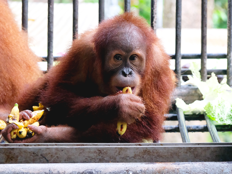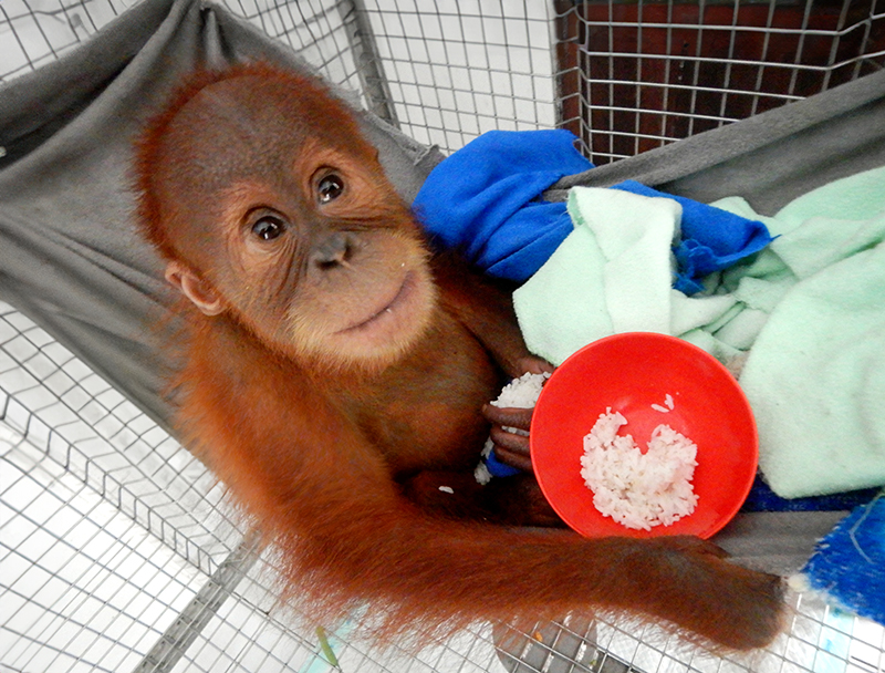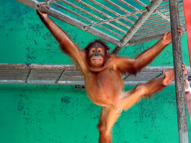 Im August 2022 wurde die junge Janet von der Forstbehörde aus einem Privathaushalt in einem Dorf in Nord-Aceh gerettet. Der Besitzer behauptete das wenige Monate alte Tier mit einer Bissverletzung durch einen Hund in seinem Garten gefunden zu haben. Daraufhin entschied er sich, sie zu behalten. Zwei Monate lang wurde Janet wie ein Haustier gehalten, mit Reis gefüttert, in Menschenkleidung gesteckt und auf YouTube zur Schau gestellt. Bei ihrer Ankunft in unserer SOCP-Auffangstation war sie etwa ein Jahr alt. Die Untersuchung durch unsere Tiermediziner:innen ergab einen Bruch am linken Arm, der in der Station erfolgreich behandelt wurde. Heute strotzt Janet vor Energie und Neugier. Zusammen mit anderen Orang-Utans lebt sie momentan im Sozialisierungsgehege, ein wichtiger Teil ihres Rehabilitationsprogramms.
